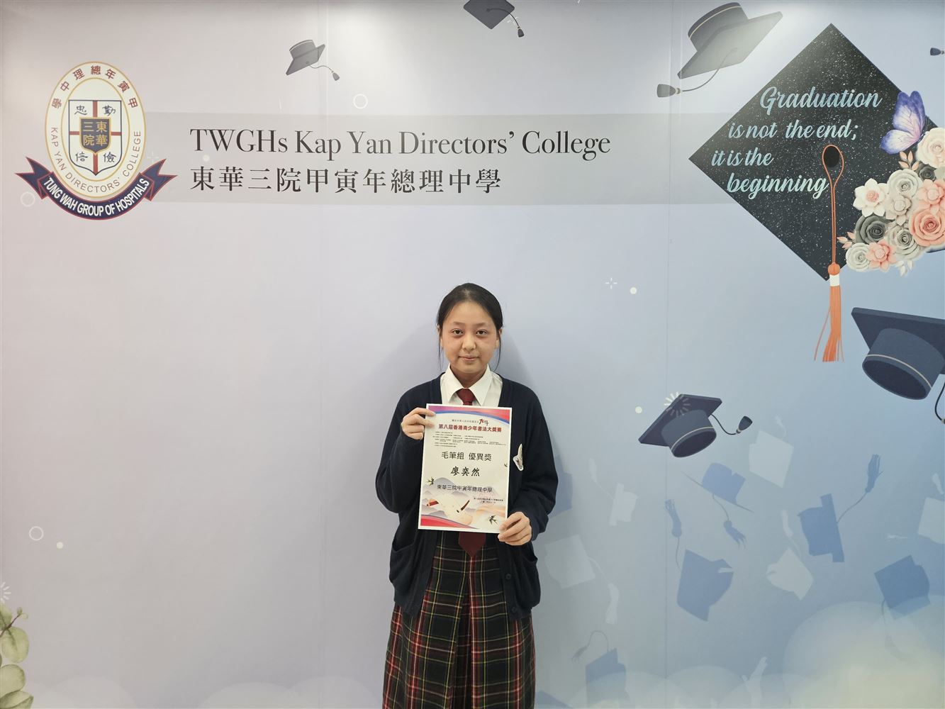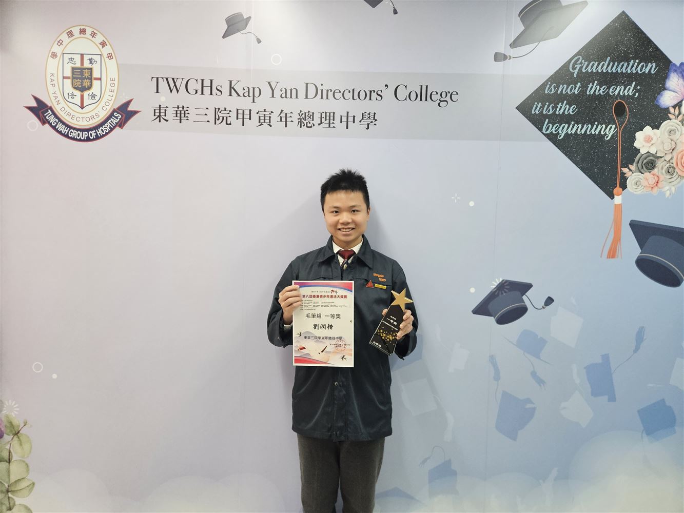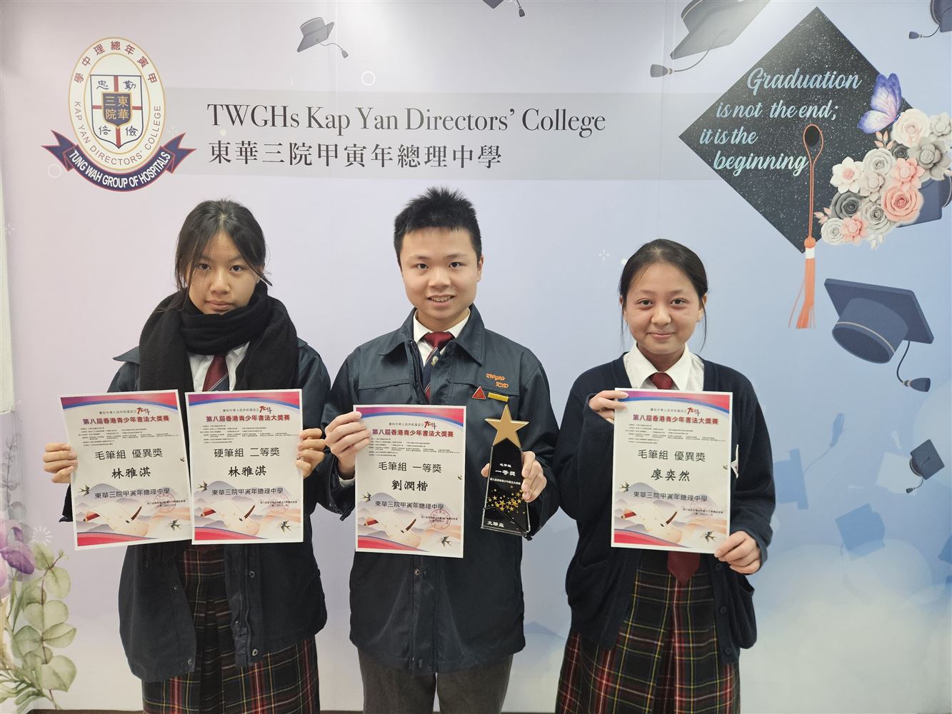 由中國書法家協會及中國文學藝術界聯合會香港會員總會主辦, 香港島校長聯會、 九龍地域校長聯會、新界校長會等協辦的慶祝中華人民共和國成立七十五周年第八屆香港青少年書法大獎賽已於日前公佈賽果。本校高中同學表現傑出,於全港中小學參賽者中脱穎而出。恭喜6E班劉潤楷同學榮獲毛筆書法一等獎,4A班林雅淇同學榮獲硬筆書法二等獎!🏆本校完整得獎名單如下: